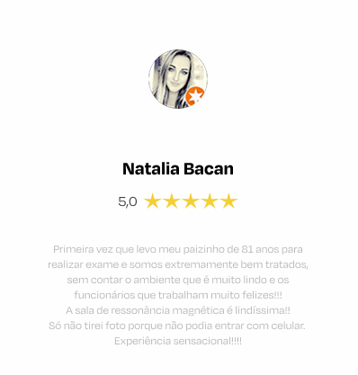 EXCELENTE Com base em 2108 avaliações Publicado em Olga31/07/2025Trustindex verifica se a fonte original da avaliação é Google. Foi a 1a vez nesta clínica e fiquei muito satisfeita desde o agendamento até a retirada do resultado.Publicado em Malu Marinucci31/07/2025Trustindex verifica se a fonte original da avaliação é Google. Fui bem atendida e sem muita espera ótimo atendimento.Publicado em Darci Fernandes30/07/2025Trustindex verifica se a fonte original da avaliação é Google. Excelente atendimento,atendentes muito educadas,atendido na hora marcada,bem organizado e limpo estão de parabénsPublicado em Dina Braga30/07/2025Trustindex verifica se a fonte original da avaliação é Google. Local muito os atendentes muito gentil atendem com gentileza. Local proporciona paz e tranquilidade.Publicado em Catiazyckus Regina30/07/2025Trustindex verifica se a fonte original da avaliação é Google. Eu indico essa clínica um ótimo atendimentoCertificado: TrustindexO selo verificado do Trustindex é o Símbolo Universal de Confiança. Apenas as melhores empresas podem obter o selo verificado que tem uma pontuação de avaliação acima de 4.5, com base nas avaliações dos clientes nos últimos 12 meses. Leia mais